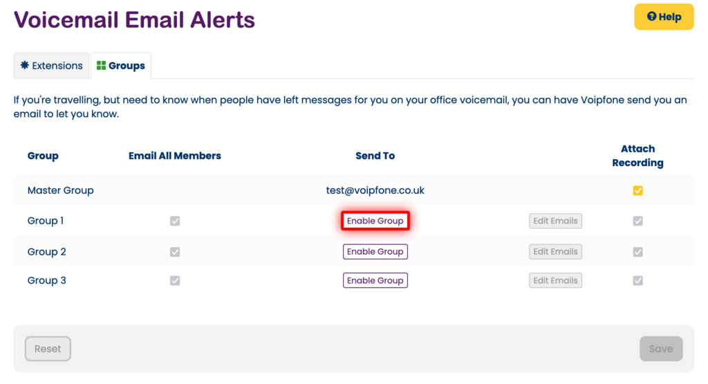 Tick the Email All box for a group to automatically email all users of that group when a voicemail is left.
